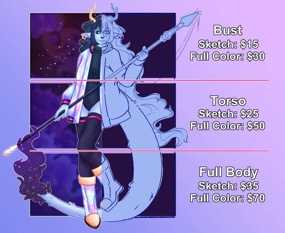 Depending on the intricacy of the request, the artwork may have additional pricing on top of the base price due to complex designs. Subjects like armor, patterned clothing, among others falls under this category. All artwork can be subject to complexity fees.FAILURE TO ADHERE TO THESE TERMS WILL RESULT IN BLACKLISTING. YOU WILL BE FORBIDDEN FROM COMMISSIONING THE ARTIST AGAIN.
